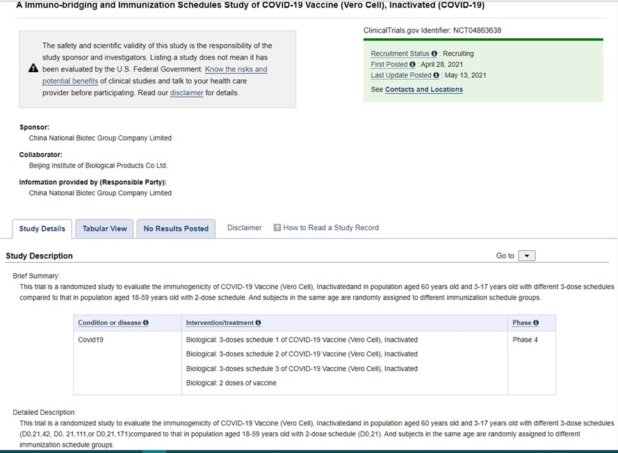 ۲.در آخرین به روزرسانی اطلاعات مربوط به تمامی واکسنهای مطرح در سایت https://www.gavi.org/vaccineswork/covid-19-vaccine ، در رابطه با واکسن سینوفارم اشاره شده است که فاز ۳ مطالعاتی در جمعیت بالای ۱۸سال را به اتمام رسانده و فاز ۴ را برای ارزیابی ایمنی، ایمنی و اثر بخشی دو دوز واکسن و به دنبال یک دوز یادآور در بزرگسالان ۱۸ سال سن و مسن تر در اکتبر ۲۰۲۱ شروع کند.(۲،۳،۴،۵،۶)