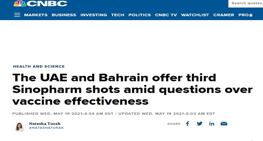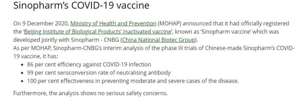 ۵. در پورتال رسمی دولت امارات به ایمنی ۸۶ % در برابر کرونا با تزریق دو دوز سینوفارم در فاز ۳ مطالعاتی انجام پذیرفته اشاره می کند و این درحالی است که چین به ۷۹.۳۴% اشاره می کند وبا آمار امارات در تضاد می باشد از سویی امارات اذعان می کند که از نحوه محاسبه کمی این میزان دستیابی ایمنی ، اطلاعاتی فاش نکرده است (۱۸،۱۷،۱۶)