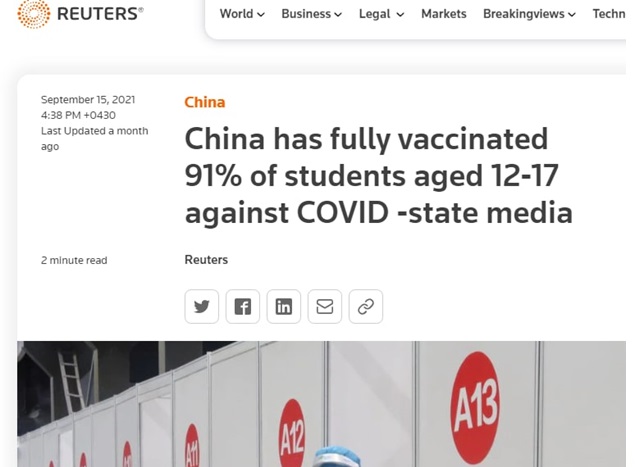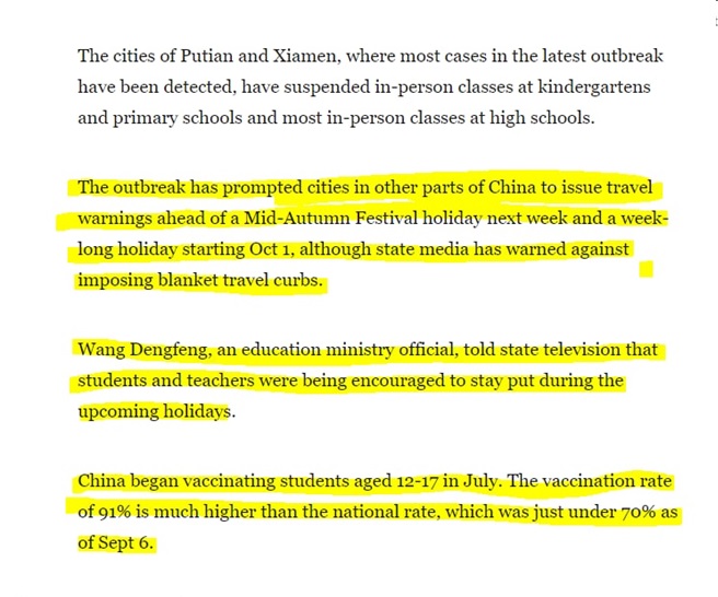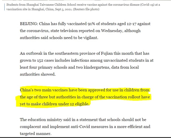 ۶.وزارت آموزش و پرورش چین ادعا می کند که ۹۱% دانش آموزان ۲-۱۷ سال خود را با سینوفارم واکسینه کرده است و گزارش وزارت خارجه نیز بر واکسیناسیون ۹۵ % معلم ها و دانش آموزان بالای ۱۸ سال تاکید می کند و این درحالی است که اولا : دولت چین اعلام داشته است که واکسیناسیون را به سنین زیر ۱۲ سال گسترش نداده است ثانیا : در همین گزارش به شیوع کرونا در مدرسه ابتدایی پوتین در استان فوجیان شرقی چین و ابتلای بیش از ۱۵۰ مورد مبتلا به کرونا طی ۵ روز و اعمال محدودیت ها و… اشاره شده است به نحوی که شهرهای متعددی در فوجیان ، مانند کوانژو و فوژو ، مدارس ابتدایی و مهدکودک ها را تعلیق کرده یا کلاس های خود را به صورت آنلاین به صورت آنلاین تغییر داده اند.