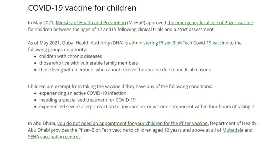 ۴.در پورتال رسمی دولت امارات متحده عربی در قسمت واکسن های ضد کرونا در امارات به صراحت به استفاده از واکسن فایزر جهت کودکان اشاره شده است و با وجود اشاره به مشارکت در فاز ۳ مطالعاتی واکسن سینوفارم جهت سنین بالای ۱۸ سال ، تا کنون گزارشی مبنی بر واکسیناسیون کودکان زیر ۱۸ سال به وسیله سینوفارم بارگذاری نشده است(۱۲،۱۳،۱۴،۱۵)