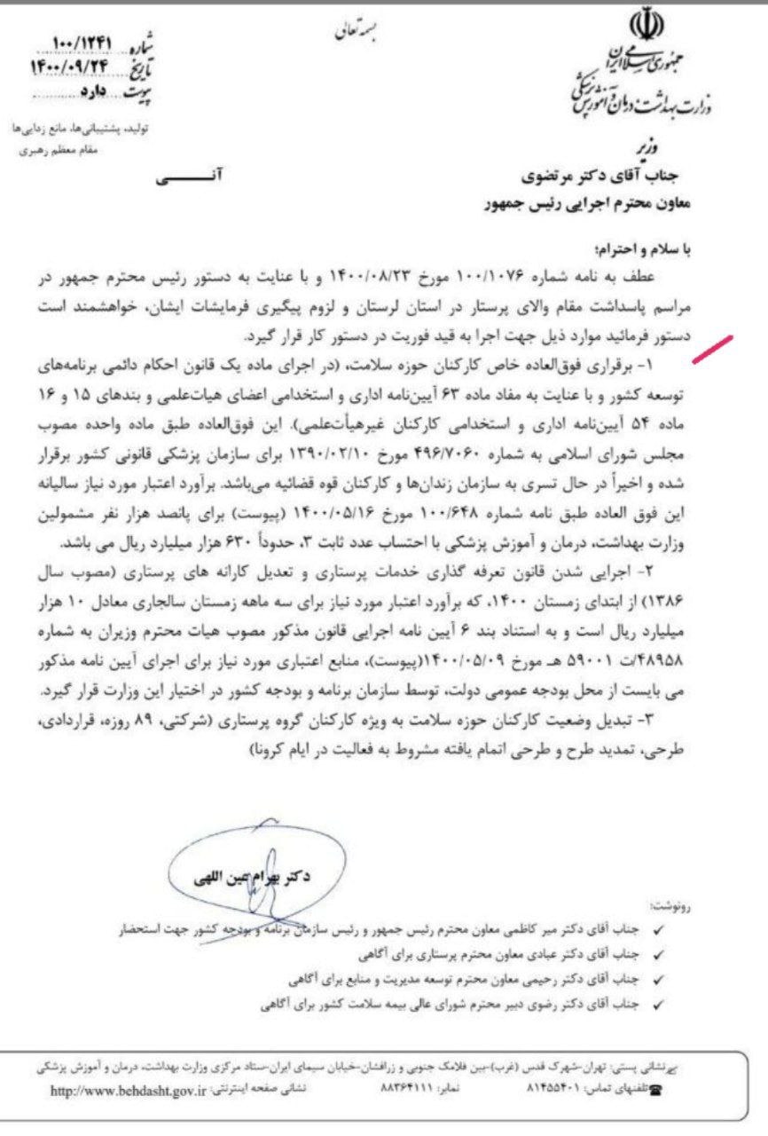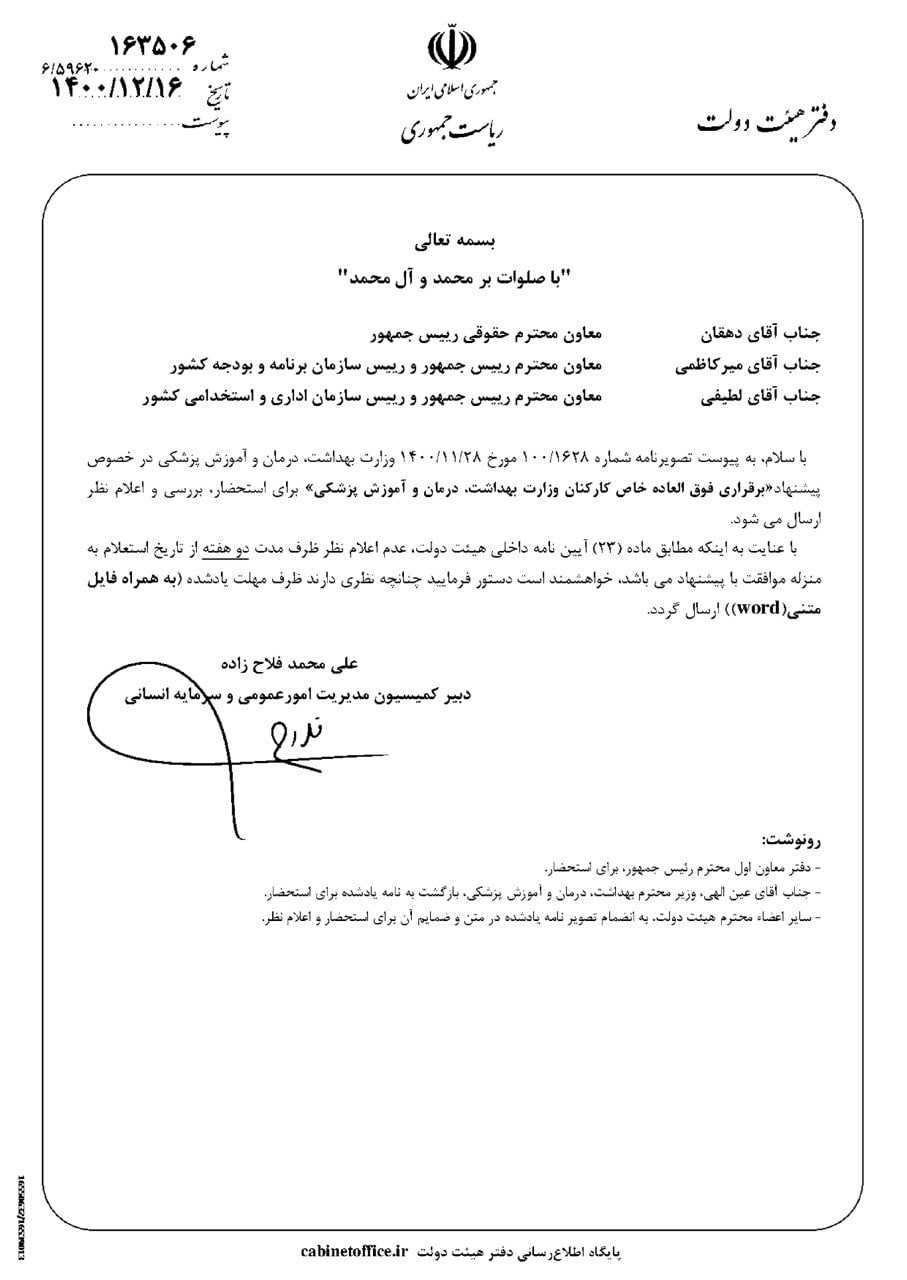 پیرو نامه دبیرمحترم کمیسیون مدیریت امورعمومی و سرمایه انسانی هیات دولت به شماره ۱۶۳۵۰۶مورخ ۱۴۰۰/۱۲/۱۶ با موضوع برقراری فوق العاده خاص کارکنان وزارت بهداشت ،درمان و آموزش پزشکی به تمامی اعضای محترم هیات دولت بخصوص روسای محترم سازمان برنامه و بودجه کشور ، سازمان ادارای استخدامی کشور و معاون محترم حقوقی رئیس جمهور
