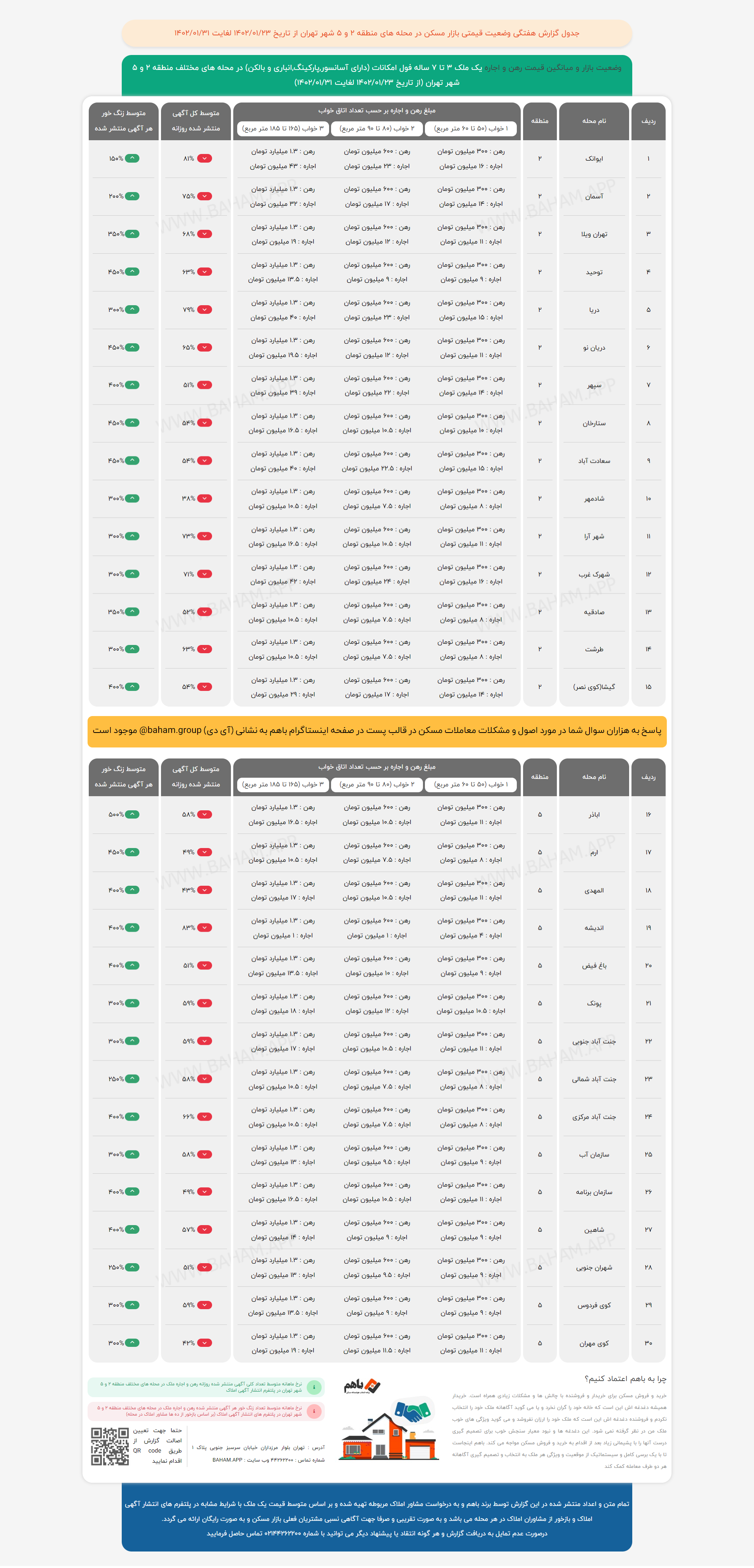 دادهنماهای زیر گزارش قیمتی بازار مسکن در مناطق ۲ و ۵ تهران طی هفته پایانی فروردین ماه ۱۴۰۲ است